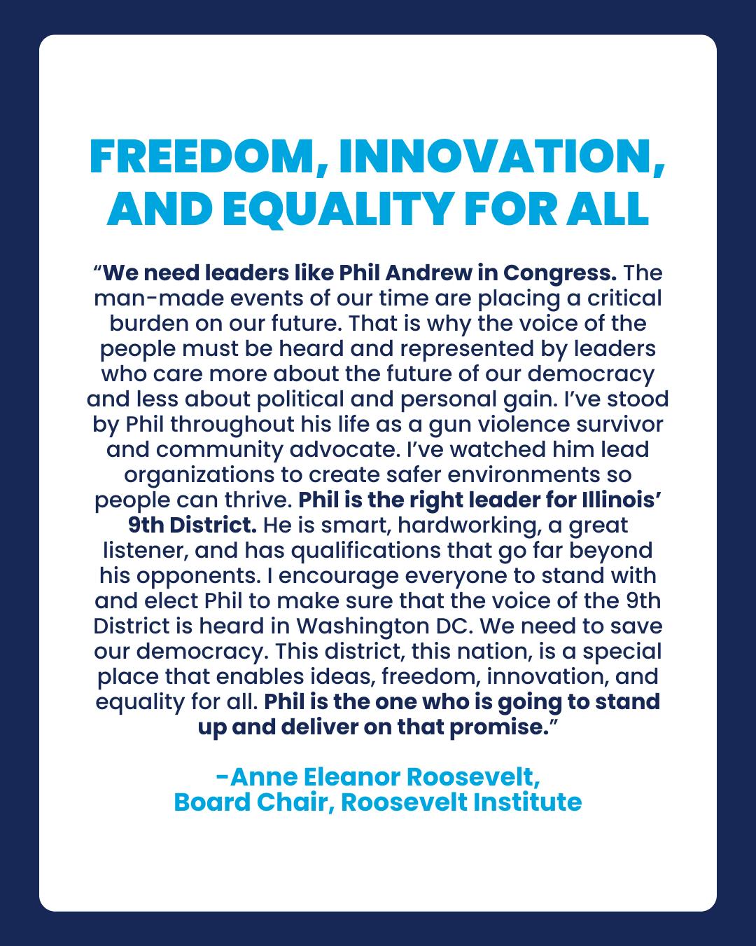 Anne Roosevelt, granddaughter of Eleanor Roosevelt, Endorses Phil Andrew for Congress