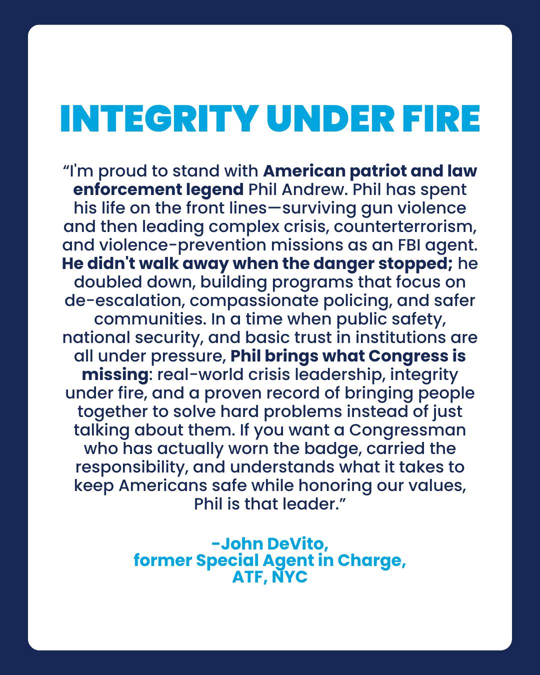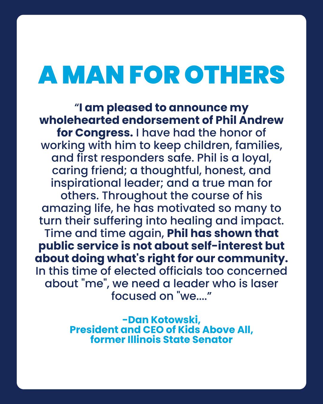 “Phil Andrew has been on the frontlines of public safety for nearly four decades. This endorsement by Brady PAC affirms that no one has more experience and dedication to gun violence prevention policy, its creation, and enforcement. From fighting for safe firearm storage and Red Flag laws, tackling hate crimes and mass violence, and battling terrorism and the corruption of gun industry money in politics, Phil has led the way in keeping dangerous weapons from dangerous people. As a former FBI hostage negotiator and a survivor of a mass shooting himself, Phil is the resilient, powerful, and expert voice we need in Washington DC to guide our country and end the crisis of gun violence – the leading cause of death of children in America.” - former Illinois Senator, Dan Kotowski